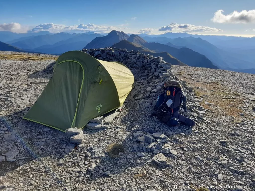 Il n’y a pas de vent au sommet, l’aventurier se retrouve seul face à l’immensité. « La vue est majestueuse, je vois même Nelson (Whakatū) d’ici. Le coucher de soleil s’annonce splendide. » Mais, un petit hic contrarie son implantation. « L’installation de la tente est technique sur ce substrat 100 % minéral, les sardines ne s’enfoncent pas, alors je fais au mieux avec les cailloux qui traînent. » Il ne reste plus qu’à croiser les doigts pour que le vent ne se lève pas cette nuit. « Car, je ne peux pas être plus exposé à près de 1800 m d’altitude », tente de se rassurer Flavien.