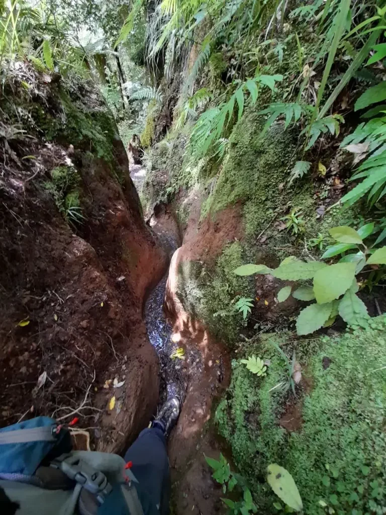 Cerise sur le gâteau, les nuages s’agglomèrent au sommet. « Quelle désillusion, je n’ai que cette idée en tête. Il me faut de longues minutes pour accepter et me raviser. » Demain les conditions s’améliorent. « J’ai trois jours de nourriture, donc, comme solution de replis, je décide de faire le Pouakai trek en attendant. » Il s’acquitte des 10 NZD pour l’emplacement, et prend la direction de Holly Hut à 17,5 km d’ici, à côté de laquelle « je poserai ma tente. » (Crédits : Flavien Saboureau)