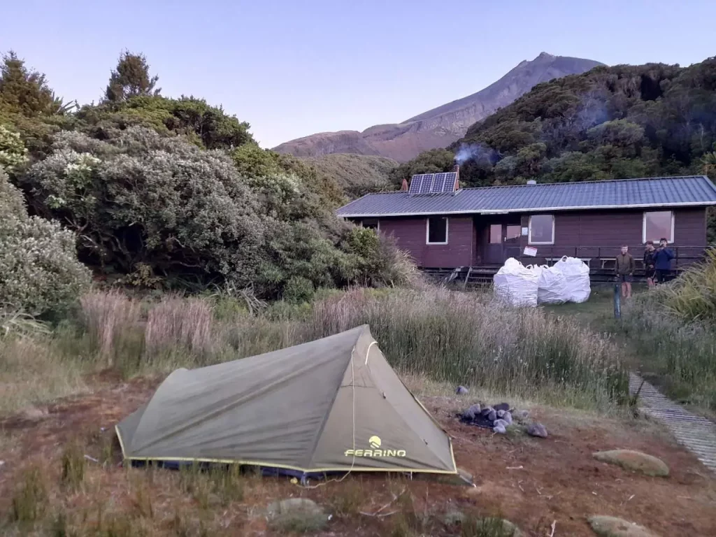 Quelques gouttes se mettent à tomber. Étonnement, elles annoncent le beau temps. « À peine arrivé, le sommet du volcan Taranaki se dévoile. Le vent se calme. » Timing et conditions idéales pour monter la tente. Juste à côté des deux autres installées sur le camp. Il est l’heure de se restaurer. Au menu du soir « Je fais des… pâtes of course ! » Pour varier les plaisirs, cette fois c’est au pesto Rosso. « Ceux qui étaient là avant ont fait un feu, c’est agréable de s’asseoir au chaud, car ce vent m’a bien refroidi. » Une fois repu, au chaud, Flavien tente de vaquer à ses occupations quotidiennes « mais le sommeil m’emporte. » À suivre…