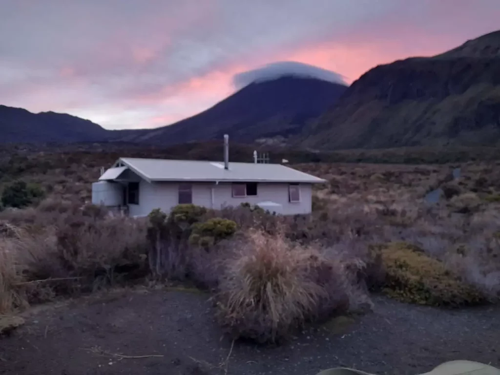 Le nuage lenticulaire qui coiffe le Mount Ngāuruhoe devient rose.