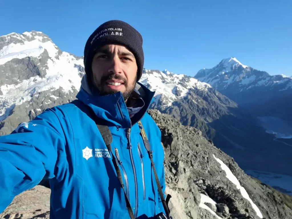 Aucun nuage à l’horizon, quel contraste avec la soirée d’hier… Pour continuer à profiter du moment, je monte jusqu’au Mont Ollivier à 1930 m. « Là haut, je suis tout seul à surplomber la vallée, à admirer les avalanches qui font un bruit fracassant dans ces vallées glaciaires qui m’entourent », commente Flavien tel un lézard au soleil. (Crédits : Flavien Saboureau)