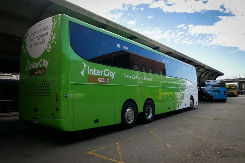 À 13 h 40 je prends le second bus en direction de New Plymouth, destination finale où l’arrivée est prévue à 17h35. Le Wi-Fi du bus fonctionne ! C’est l’occasion d’envoyer de nombreux e-mails, de se renseigner pour la suite. « Ça tombe bien, car il pleut et les paysages n’ont rien d’exceptionnel. » (Crédits : InterCity)