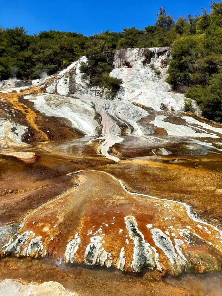 « Ce matin, je suis levé bien avant huit heures, mais quelle surprise de me retrouver seul dans la chambre. » Après avoir récupéré la voiture de location, l’aventurier se dirige vers les champs géothermiques. La première étape est le Wai-o-tapu, le plus connu de tous. « J’arrive là-bas vers neuf heures », souligne-t-il. Après s’être acquitté des 45 NZD d’entrée, et avoir reçu un coup de tampon sur le poignet, il profite du peu de monde pour faire son tour. Sans omettre la grimace de rigueur concernant l’odeur de souffre : difficile de s’habituer souffre -t-il.