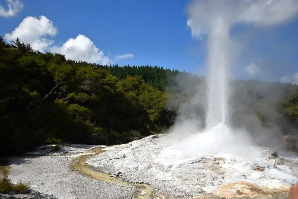 C’est un geyser qui est déclenché une fois par jour… grâce à du savon. « Ce n’est pas très naturel, mais il fallait payer une fortune pour voir le seul autre geyser de Nouvelle-Zélande qui se soulève spontanément une à deux fois par jour », explique-t-il. Arrivée dans les premiers, la foule ne tarde pas à s’amasser. « J’ai l’impression d’être au Puy du Fou », s’exclame Flavien, entouré d’une bonne centaine de personnes.